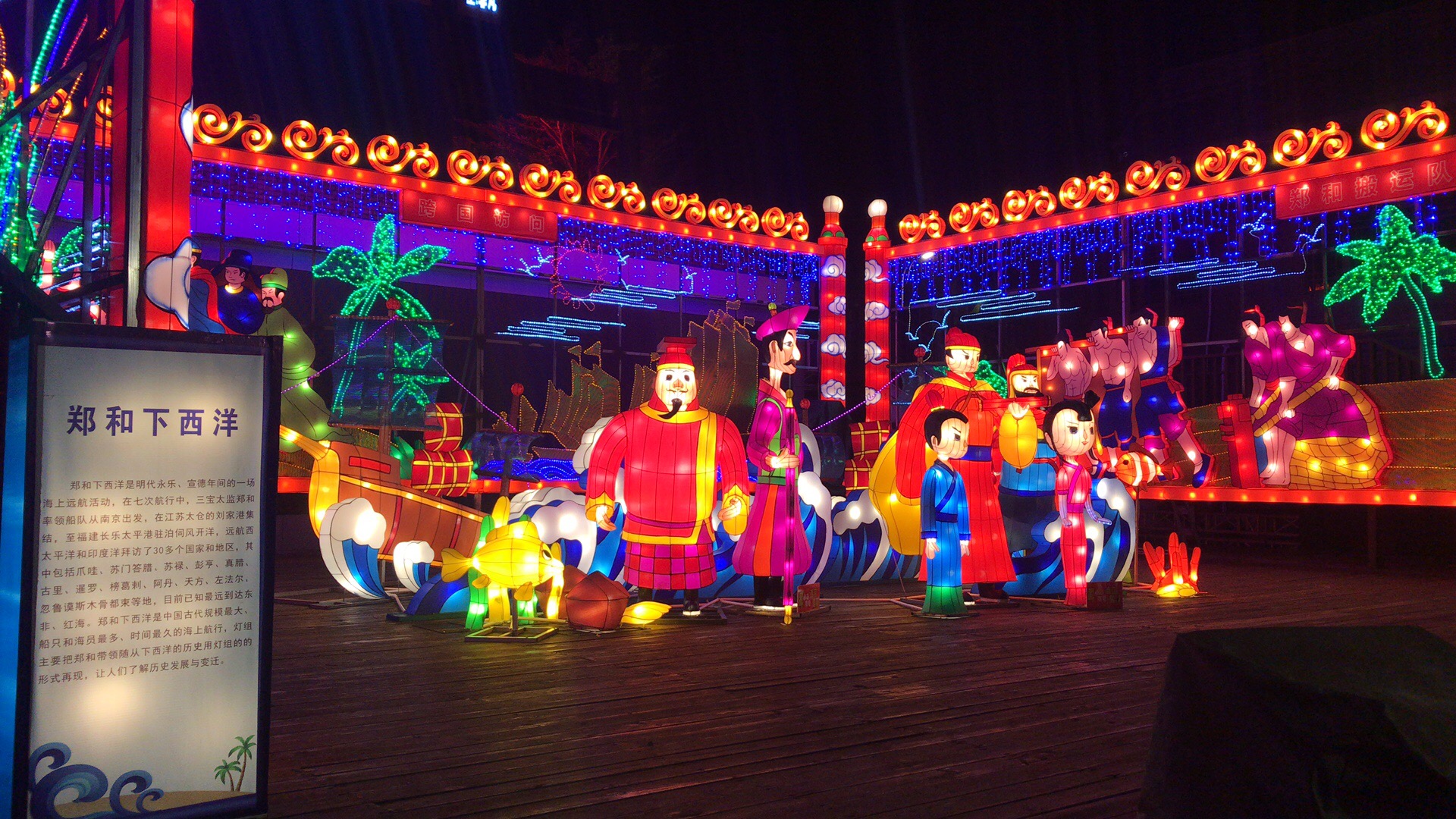 《鄭和下西洋》燈組再現(xiàn)明代永樂、宣德年間一段家喻戶曉的歷史故事,燈景交融,引人入勝,讓人仿佛置身于故事情節(jié)中。