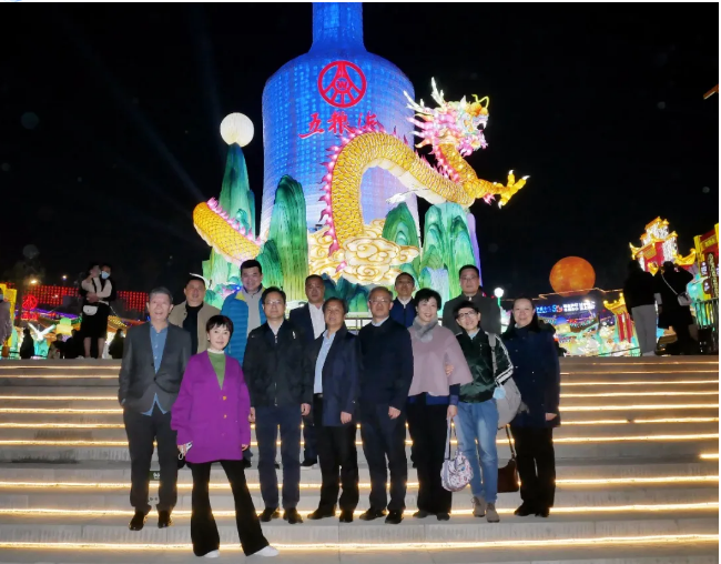 (考察團(tuán)一行在公司創(chuàng)意、設(shè)計、制作的《五糧液》燈組合影)